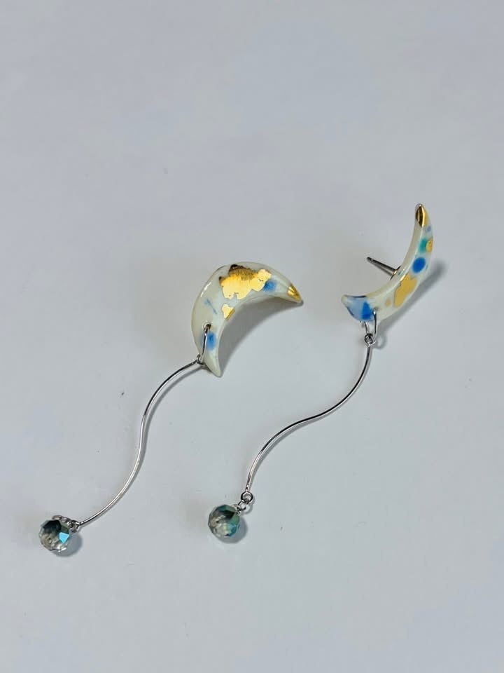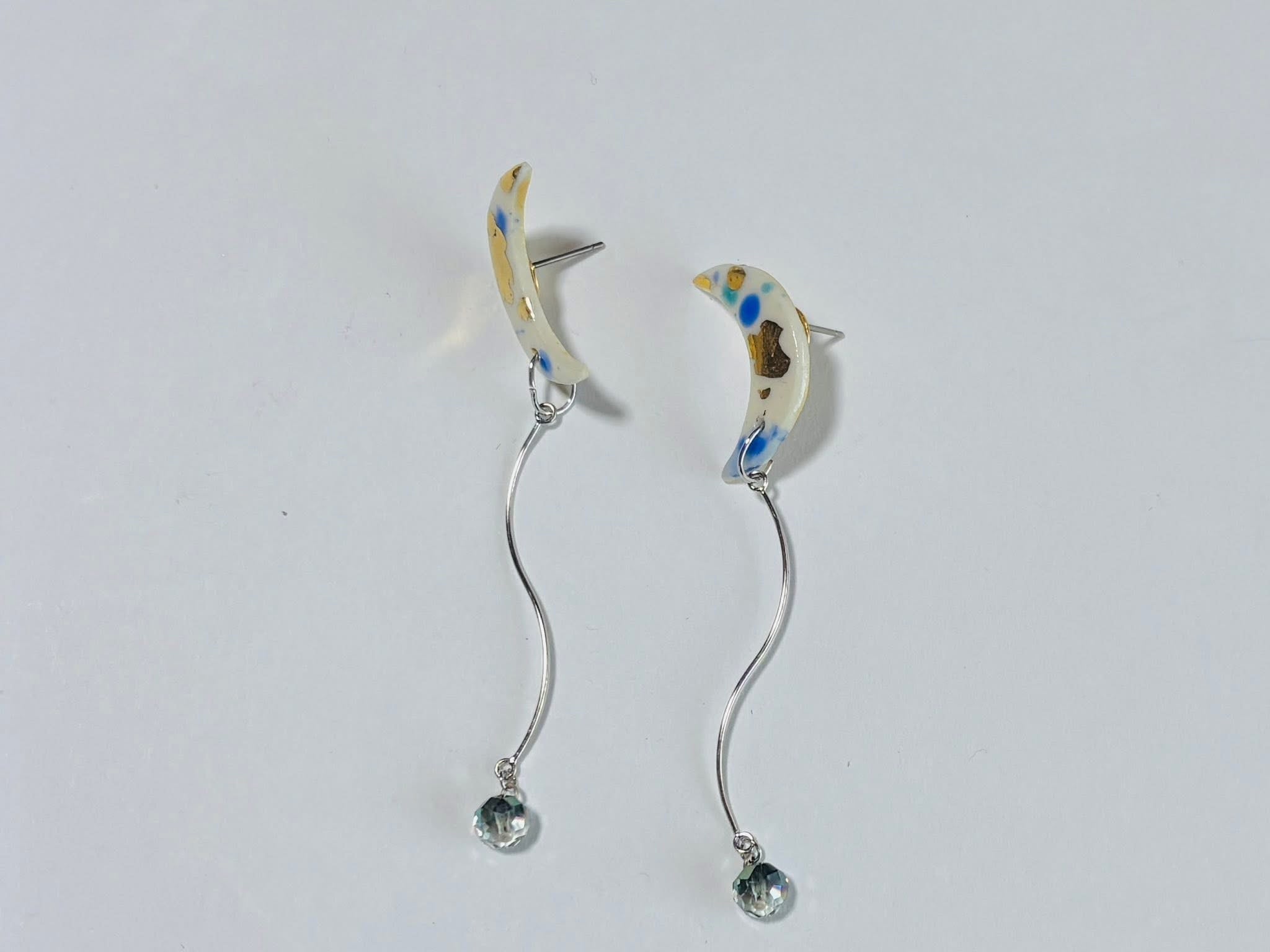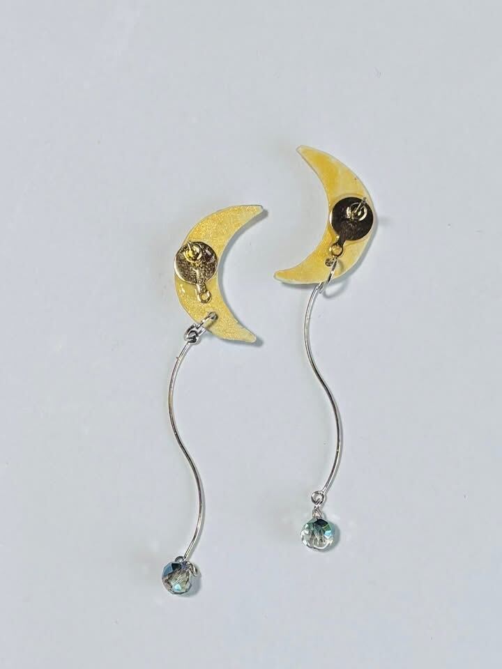 幻想的な月の輝きを耳元に -月のピアス・ガラスビーズ- こちらは、透明感のあるガラスビーズと月をモチーフにした洗練されたデザインが特徴のアクセサリーです。柔らかな光が耳元でさりげなく輝き、あなたの魅力を引き立てます。軽やかな着け心地で、カジュアルな日常使いはもちろん、特別なシーンでも存在感を放ちます。