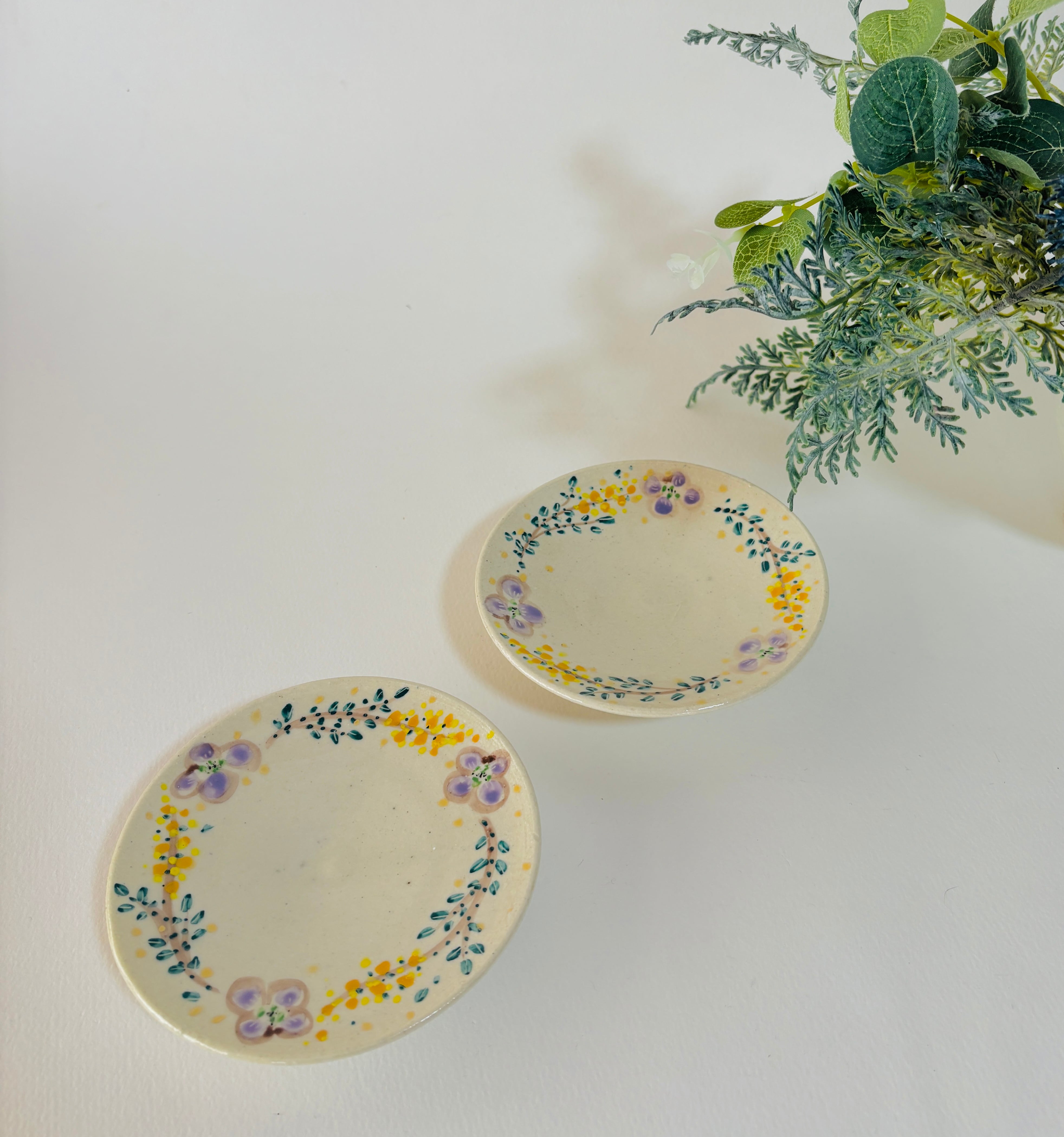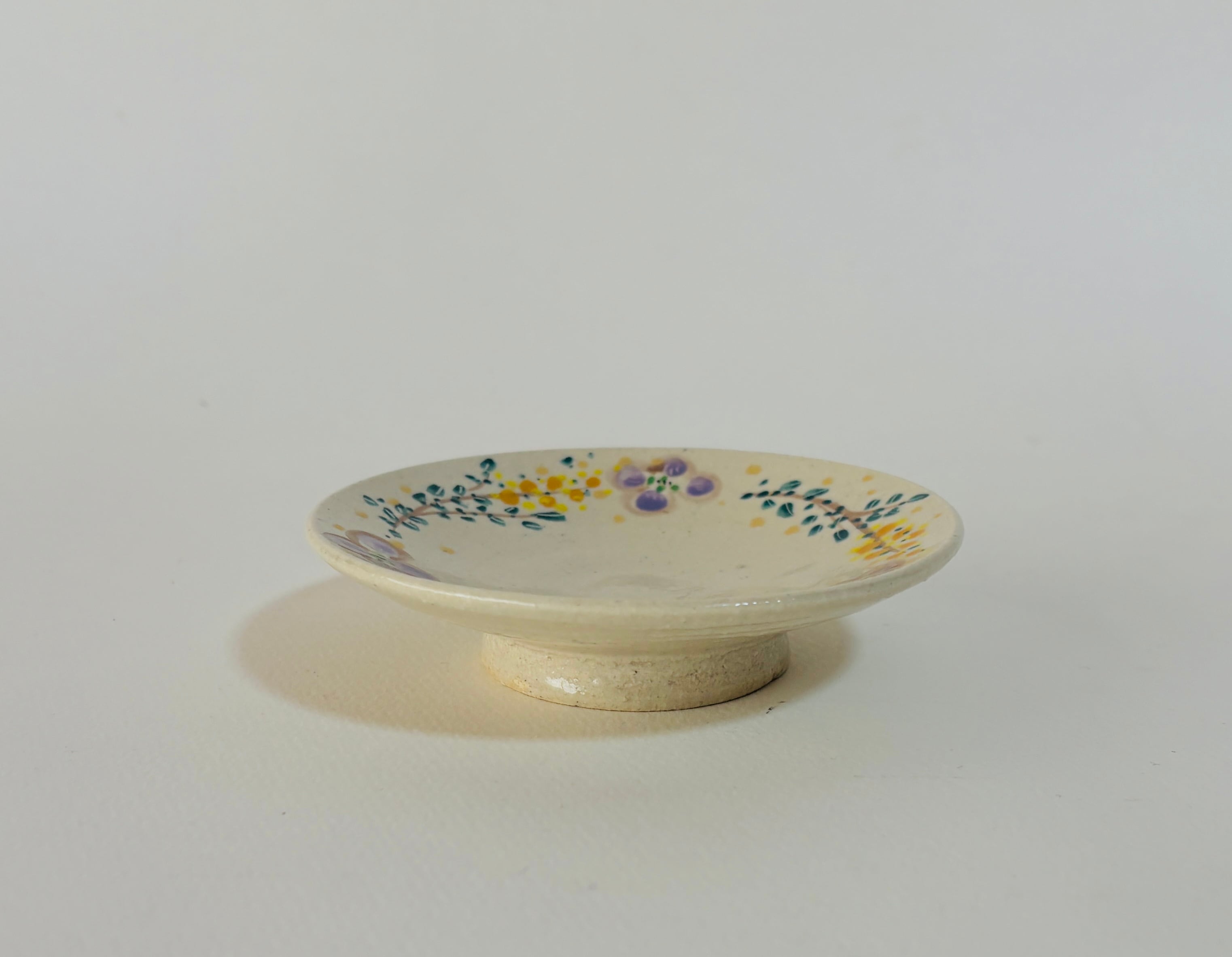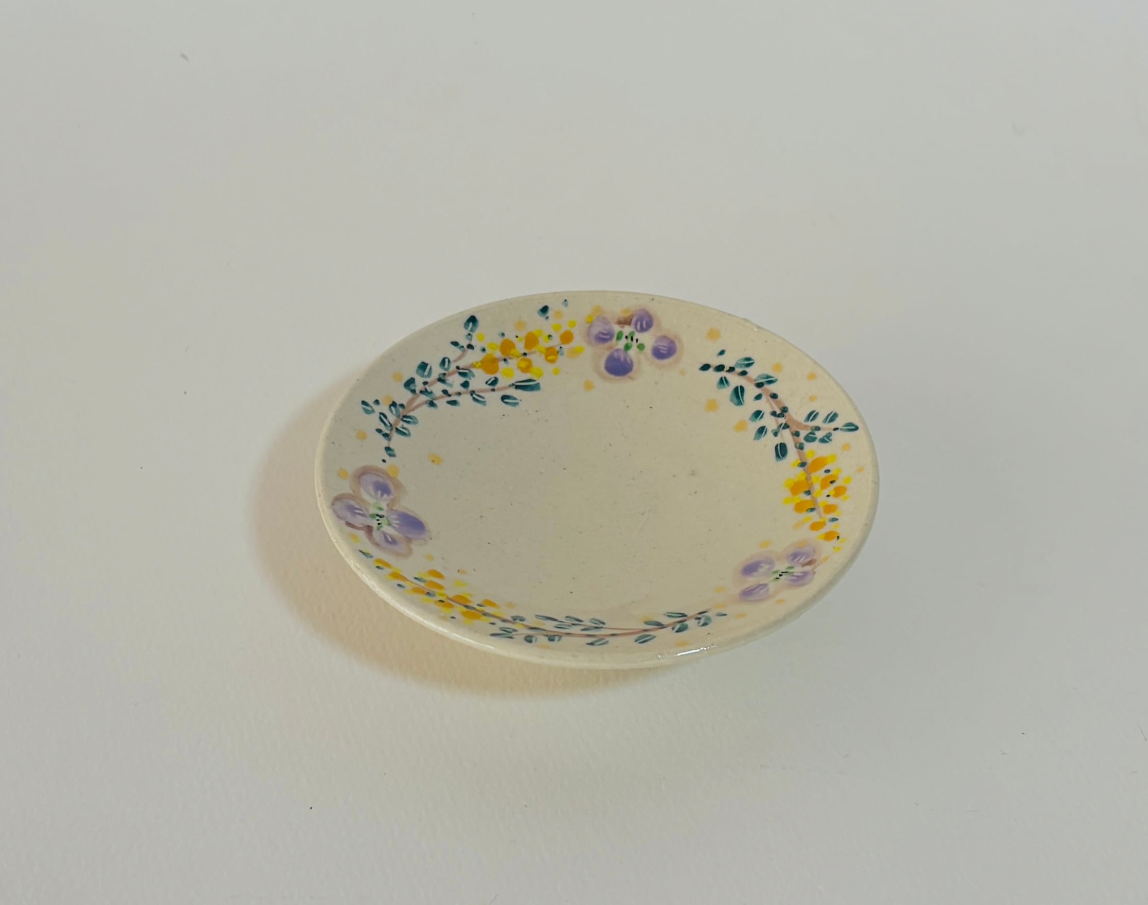 お菓子や取り皿としても大活躍な少し高さのある小皿にやさしいミモザを描きました♪